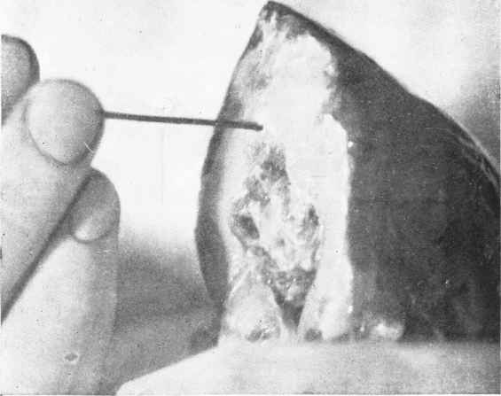 | Fig. 23.    Pithing a Fish Preparatory to Operating Upon Its Eyes The object of this operation is to secure greater relaxation of the muscles of the eyes and head, which would work for hours, without external stimulus, if the brain cells were not destroyed by the probe. | ||