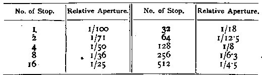 as suggestedby Dr. Rudolph, and the actual working aperture of the lenses is taken as the diaphragm aperture. The following table gives, therefore, the connexion between the relative or ratio aperture and the stops : - |
