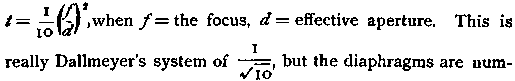 The photographic exposure corresponding, for all practical pur-poses, to the different stops, is, therefore, in the inverse ratio of those numbers. Goerz, the optician of Berlin-Schoneberg, has adopted yet another system of marking the diaphragms ; this is the relative time of exposure (f) calculated from the formula