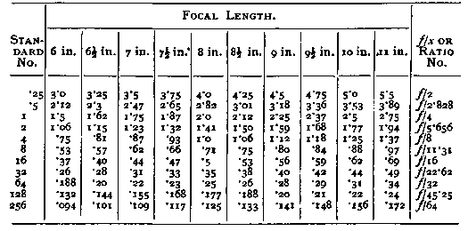 We have stated above that to determine the value of the diaphragms it is necessary to find-the focal length and divide this by the aperture of the diaphragm. Burton gives a very convenient table in his useful little handbook, " Modern Photo-graphy," which gives the diameter of the stop aperture for lenses of any focus from 6 to 11 in., and the diameter of any aperture for lenses of less or longer focus may be found by multiplying or dividing, as the case may be. We here insert this useful table: - |