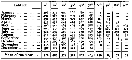 | The following table by Dr. Spitaler may be regarded as sup-plementary to the foregoing, as it will enable Dr. Holetschek's results to be applied with sufficient accuracy to other degrees of latitude: -  Spitalers Table of the Chemical Intensity of the Light for every ten degrees of latitude, for the northern hemisphere, and the middle of each month. This may be used for the southern hemisphere by altering the time of year; thus, January in the place of July, etc. | ||