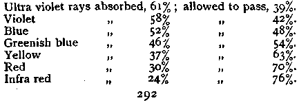 | The variation of light during the day is a very important matter, and practice seems to have proved that the most intense light is on a cloudless   sunny day about 11 to 12 in the morning; after noon the intensity sinks, because the heat of the sun has filled the air with aqueous vapour and the sun itself has begun to sink, and therefore its light, passing through a greater and ever-increasing thickness of atmosphere, loses in a marked manner its chemical activity, which resides, as we have already seen, in the blue and violet rays, which are more quickly, and in greater proportion, absorbed than the less refrangible rays. Professor Langley (Washington, 1884) has given the following results of the experiments carried out by him, as to the absorption of the different rays of the spectrum. | ||