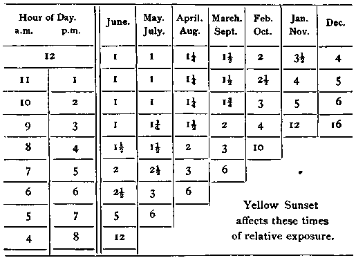 From this it is obvious that the greater the thickness of atmo-sphere through which the sun's rays have to pass, the greater the absorption of the chemical or more refrangible rays. The chemical power of the sun's light is, moreover, dependent on the absence or presence of dust, the height of the barometer, etc. Again, the wind has some influence, because when a dry north-east or east wind prevails, and prevents the condensation, or rather the increase, of the aqueous vapour, the chemical intensity of the light will increase; on the other hand, when a wet south-west or west wind prevails, the increase of the aqueous vapour will lower the intensity. Clouds, we all know, play an important part in determining the duration of exposures, but there are clouds and clouds. Thin haze or mist, such known as u heat mist," lowers the chemical power enormously; yet optically there is little difference. The fine white masses of clouds floating in a blue sky rather increase than decrease the power of the light, in that they act as enormous reflectors of the sun's light. Generally* however, when the sky is cloudy and the sun not actually shining, the exposure is about three times that with the sun out; with a dull leaden pall of cloud the chemical intensity of the light may be reduced to one-fourth or one-eighth, or even more. The fol-lowing table by Dr. J. A. Scott may be useful: - |