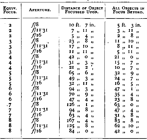 Fractions of an inch are unnecessary. On reading through the above table many readers may at once exclaim, "If this is right, Messrs. Blank & Blank, lens makers or lens sellers, are wrong when they state that all objects beyond so many feet will be in focus with their lens; their distances are not nearly so much as the above table. Take, for instance, one special hand-camera: this has a 5-in. focus lens, and works at//8, and yet the vendor states that everything beyond 15ft. is in focus: by the above table everything beyond 32 ft. is in focus." To reconcile these seeming paradoxes is not difficult, as it will be noted that Mr. Cheyney takes -j1 of an inch as the greatest permissible error; if, however, we take £§« of an inch as the permissible error we get totally different results, as seen by working out his examples: -