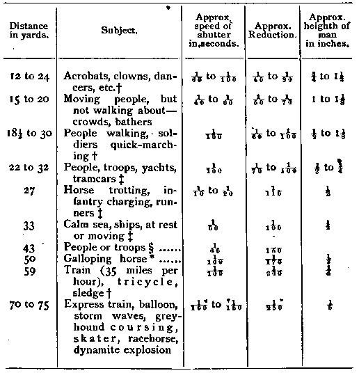 | One condition of obtaining the most successful results is to watch the moving object till it attains that position which is commonly called the dead point or position, and which is well seen in the case of a ball thrown perpendicularly up into the air. For some time the ball travels up, and then just for one almost inappreciable period of time it is stationary, and begins its down-ward course, and an exposure should be made just at the moment of reversal of motion. It will be found that with many moving objects some such dead point will occur, and the successful worker seizes  this  moment  to  expose.     Too many amateurs * The exposure to be made at the moment of partial rest or least movement. t Object moving across the field of view. J Object moving across the plate. ยง Object moving to or from lens or only slightly across 407 | ||